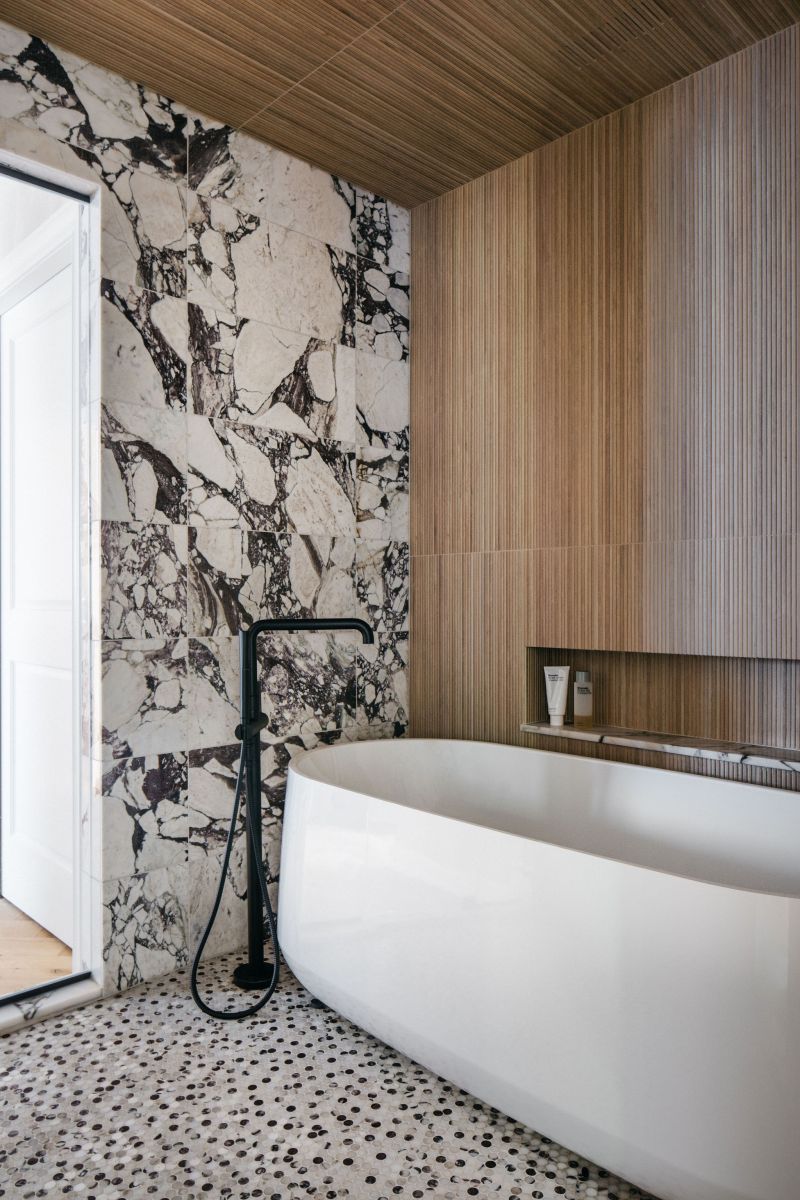 Bathroom ceilings are an often-overlooked resource, but this year it’s going to move to center stage. The ceiling expanse can be decorated in any number of ways: mosaic tiles, wood, vibrant paint colors with a high gloss, or alternatively wallpaper — all making it a special place to accent. 2024 bathroom trends will see the ceiling converted into a practical canvas for playful experiments.