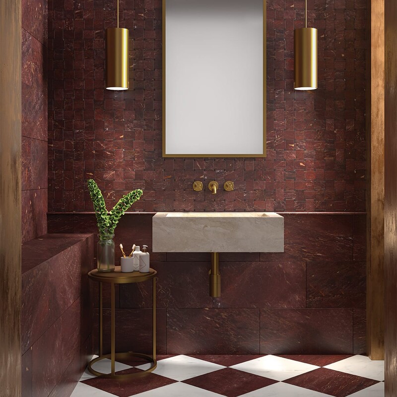 Natural stone offers luxury, and can last a lifetime, but does require sealing and care. So, we want you to think about where you are putting it — for instance, you may choose natural stone vs porcelain in a primary bath or powder room, and look to porcelain for a kids bathroom. For high-traffic spaces like a mudroom, a durable porcelain option can deliver beauty without the upkeep.