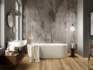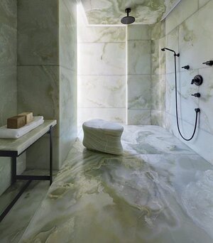 A Hidden Gem: The popularity of Onyx and Agate slabs has exploded off of vision boards and into real life application on shower walls and other areas. We are seeing these stones used for bar backsplashes and special feature walls throughout the home. The adoration for these stones has lead to Porcelains made to look like both Onyx and Agate. Coming in large formats like 24×48, 67×124 and other options, the porcelains give you an amazingly close to perfect look for a fraction of the cost of the full slabs.